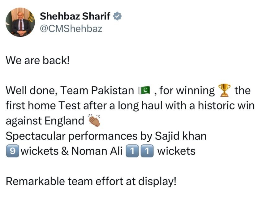 • Chief Minister Punjab Maryam Nawaz Sharif Congratulates on Multan Test Victory